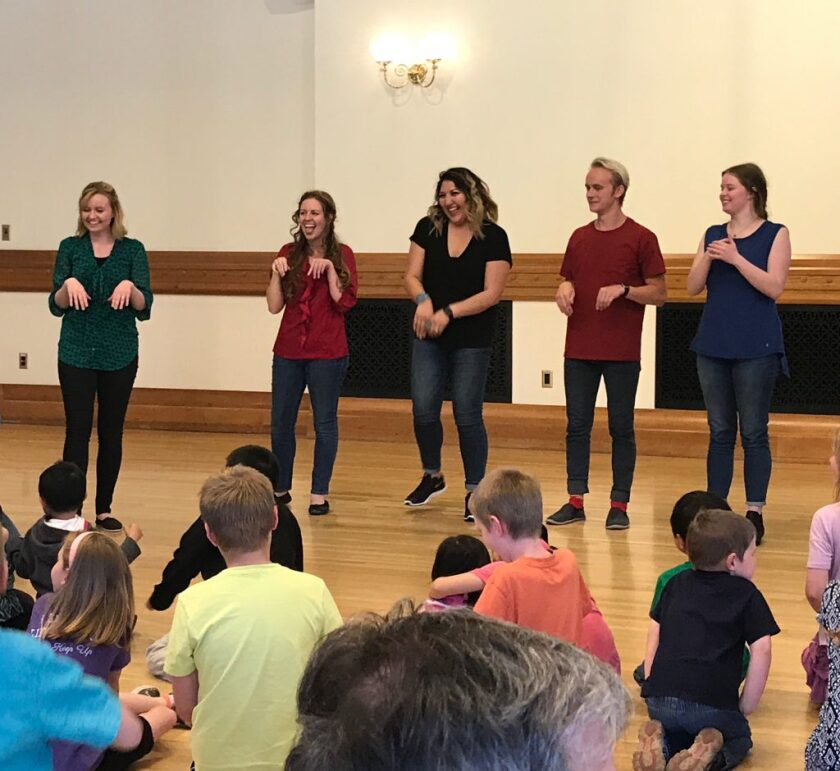 They were asked to come up with other actions to depict the six adjectives. For example, a kneel and a hand over the heart resembled loyalty for Hylas, yet a child in the audience came up with a dog also being a symbol of loyalty. So everyone acted like dogs! Lastly, Kindi and Taylor asked the children to describe a time when they felt like they possessed these different character descriptions, and to share the story with the group.