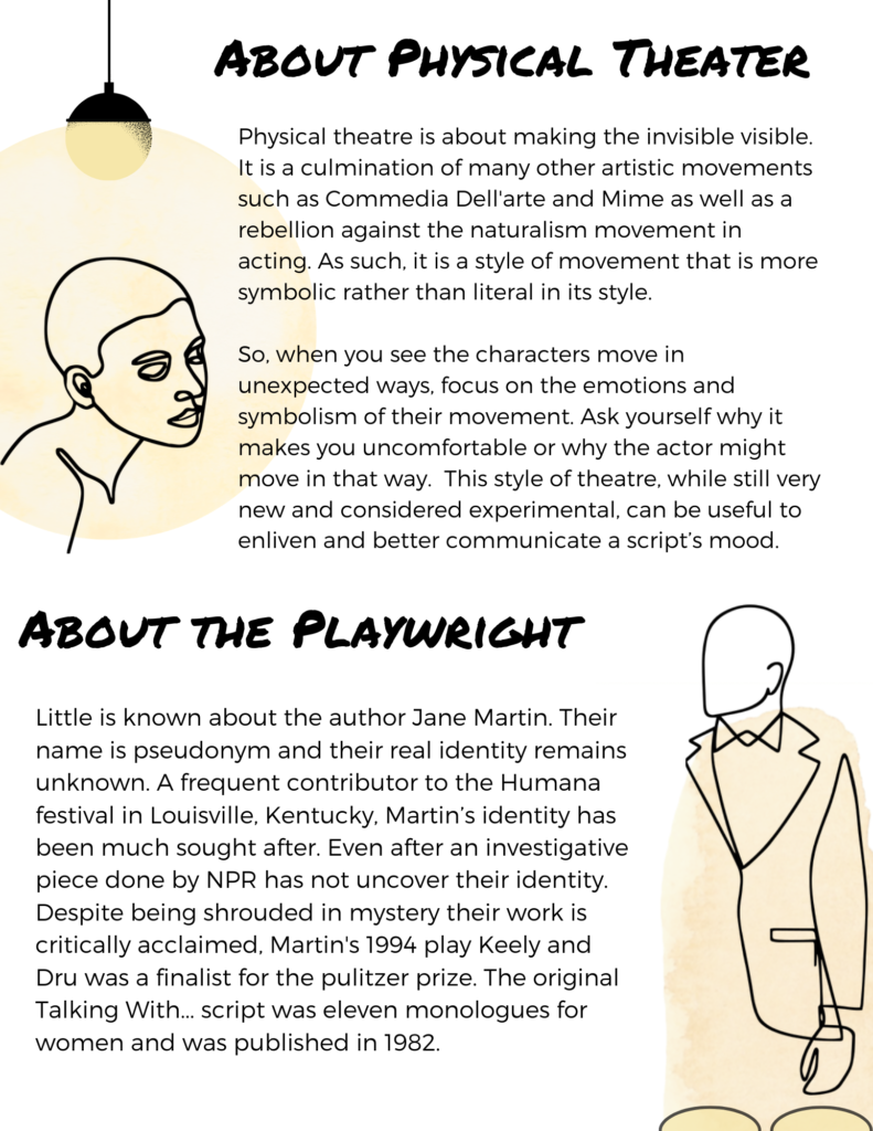 by Lillian Bills and Spencer Fields, dramaturgs This student theatre lab (mask club) production of Talking With... by Jane Martin was directed by Sarah McDonald, with dramaturgy by Lillian Bills and Spencer Fields. Below you can scroll through the virtual program for this production, or download the PDF version if you prefer. Thanks for watching!